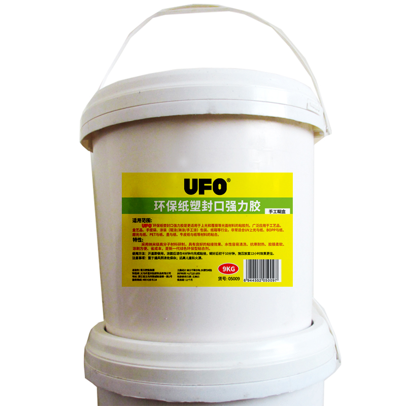 适用范围: UFO环保纸塑封口强力胶是更适用于上光和复膜等光面材料的粘胶剂。 广泛应用于工艺品、盒艺品、手提袋、涂装(辊涂/淋涂/ 手工涂)包装、纸箱等行业。非常适合UV上光与纸、BOPP与纸、磨光与纸、PET与纸、 油墨与纸、牛皮纸与纸等材料的粘合。